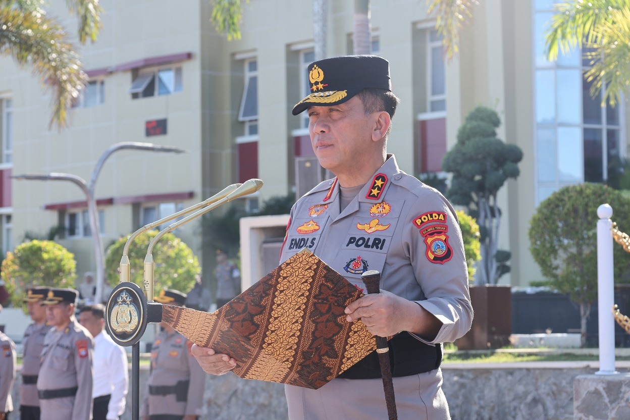 Palu — Kepala Kepolisian Daerah (Kapolda) Sulawesi Tengah (Sulteng) Irjen Pol Dr Endi Sutendi, menghadiri sekaligus menjadi Inspektur Upacara pada pelaksanaan Upacara Peringatan Hari Kesadaran Nasional Bulan April 2026 yang digelar pada Jumat 17/04/2026 pagi, di lapangan apel Mapolda Sulteng.