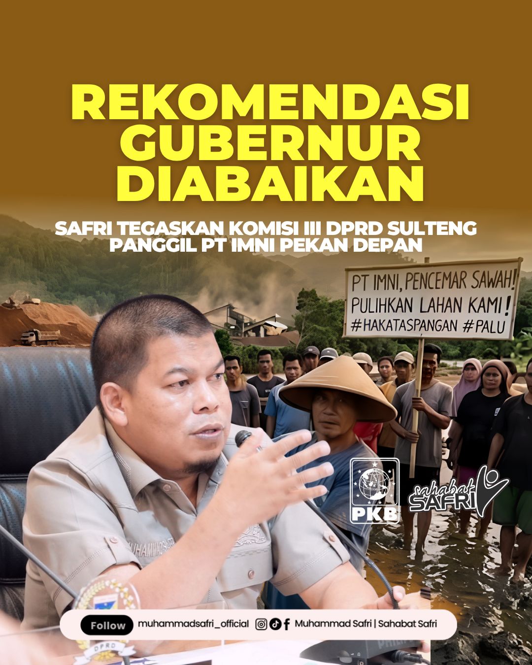 PALU – Sekretaris Komisi III DPRD Sulawesi Tengah, Muhammad Safri, menegaskan pihaknya segera menindaklanjuti tuntutan masyarakat Desa Mayayap dan Trans Mayayap, Kecamatan Bualemo, Kabupaten Banggai, terkait belum direalisasikannya rekomendasi Gubernur Sulawesi Tengah kepada PT Integra Mining Nusantara Indonesia (IMNI).