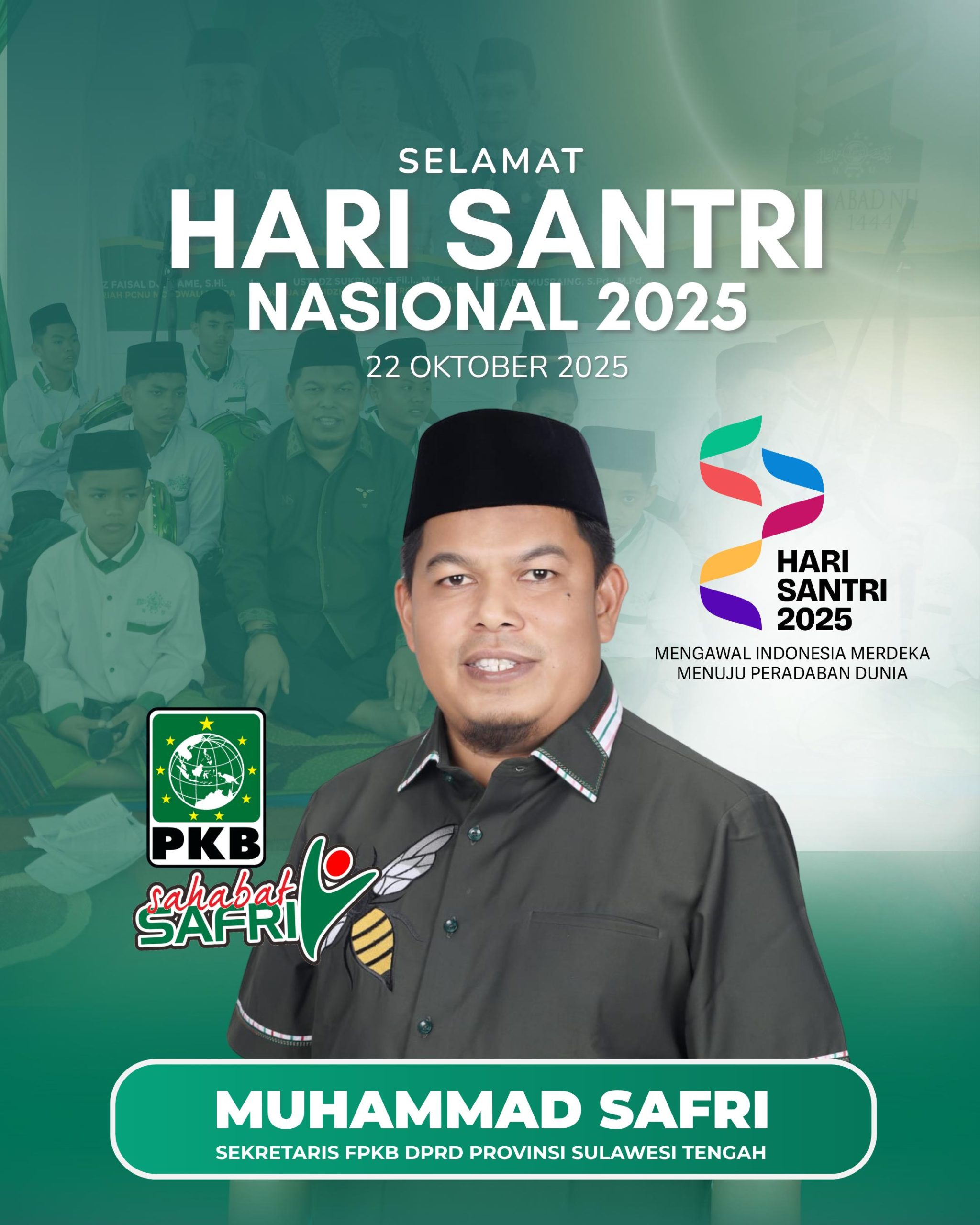 Palu- Peringatan Hari Santri Nasional (HSN) yang jatuh pada hari ini, Rabu (22/10/2025) menjadi momen spesial bagi Sekretaris Fraksi Partai Kebangkitan Bangsa (FPKB) DPRD Sulawesi Tengah, Muhammad Safri.