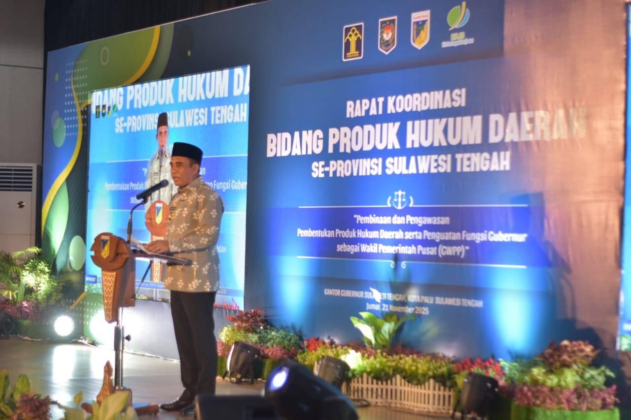 Palu— Kepala Biro Hukum Setda Provinsi Sulawesi Tengah, Adiman, SH., M.Si., menegaskan pentingnya pembinaan hukum hingga ke tingkat desa dalam Rapat Koordinasi Bidang Produk Hukum Daerah se-Provinsi Sulawesi Tengah yang digelar di Kantor Gubernur Sulteng, Jumat (21/11/2025).