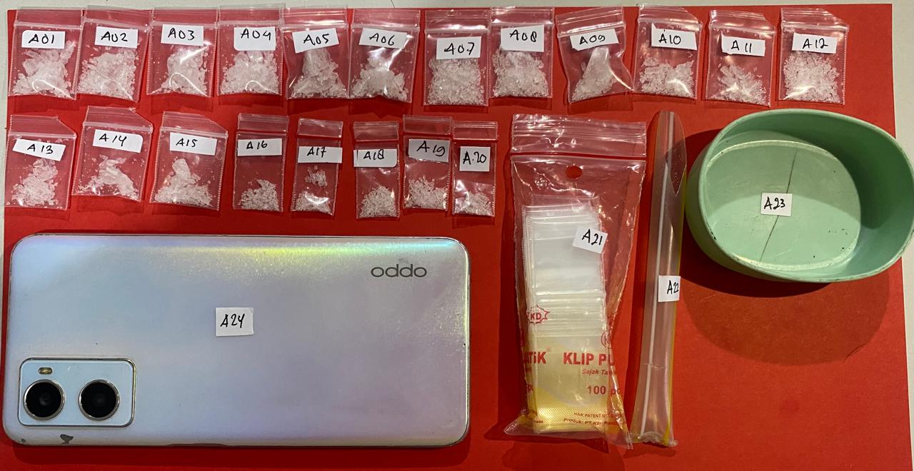 Dari hasil penggeledahan, petugas menemukan barang bukti berupa 20 paket yang diduga sabu dengan berat bruto 9,123 gram, satu pak plastik klip kosong, satu sendok plastik dari pipet, satu wadah plastik warna hijau toska, serta satu unit telepon genggam.