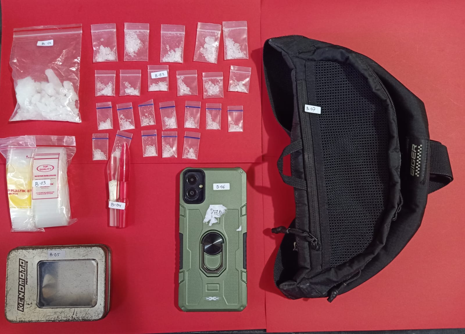 Selain sabu, petugas juga menyita dua pak plastik klip kosong, dua sendok plastik terbuat dari pipet, satu unit ponsel warna hitam, satu kotak kaleng abu-abu, dan satu tas samping warna hitam.